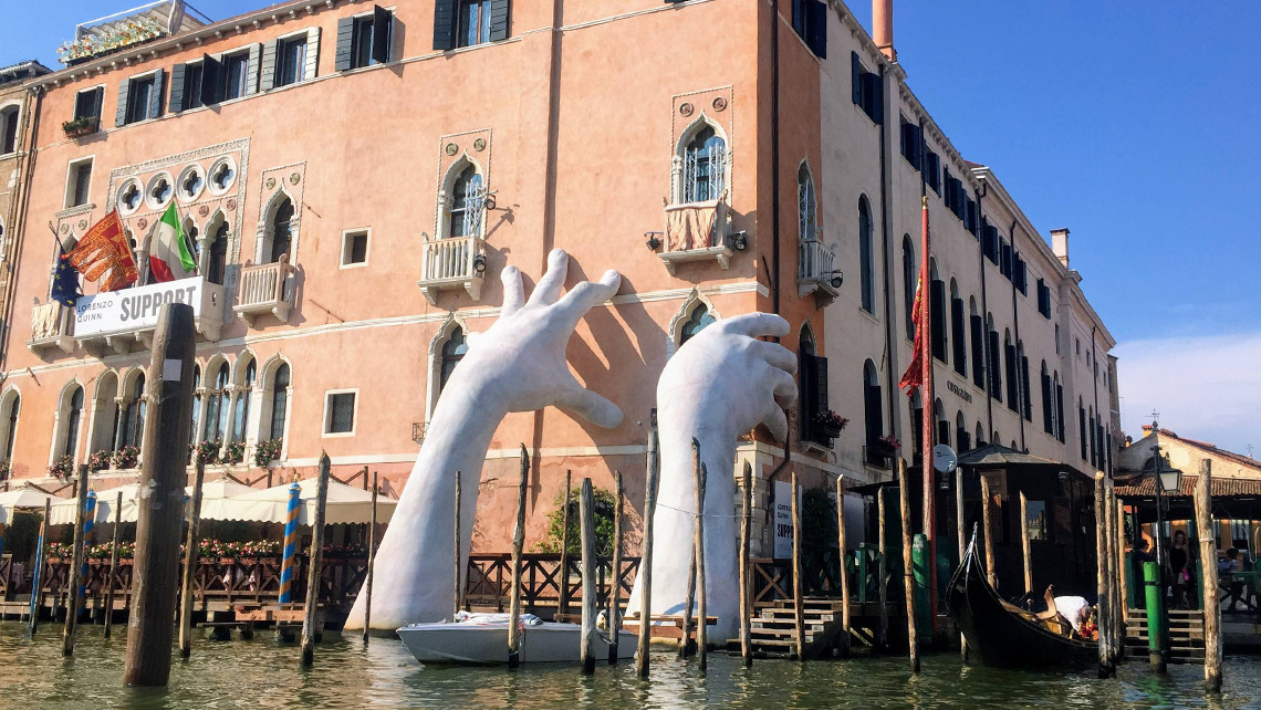The artwork, titled Support, shows two huge hands emerging from the canal to "support" the historic Ca' Sagredo Hotel in such a way that they appear to be preventing the 14th-century building from sinking into the water.